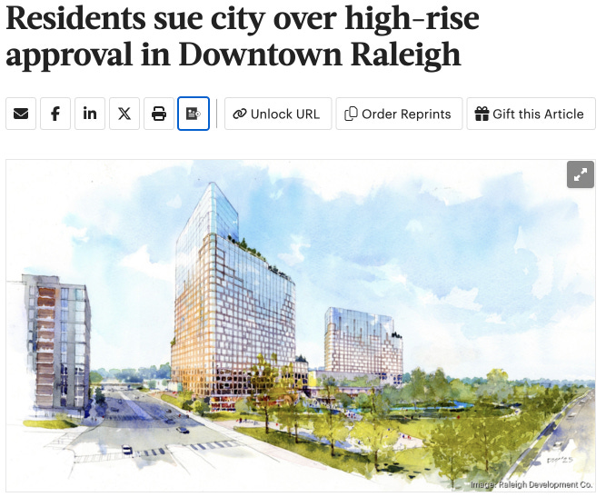 2025-12-10 — Residents are suing the City over the zoning request/approval tied to the proposed 30-story building. WRAL News